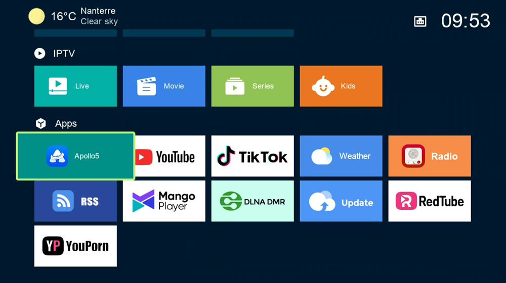 And the device supports also Apollo5 web Live TV, offering an extensive selection of live sports, news, and entertainment channels.
